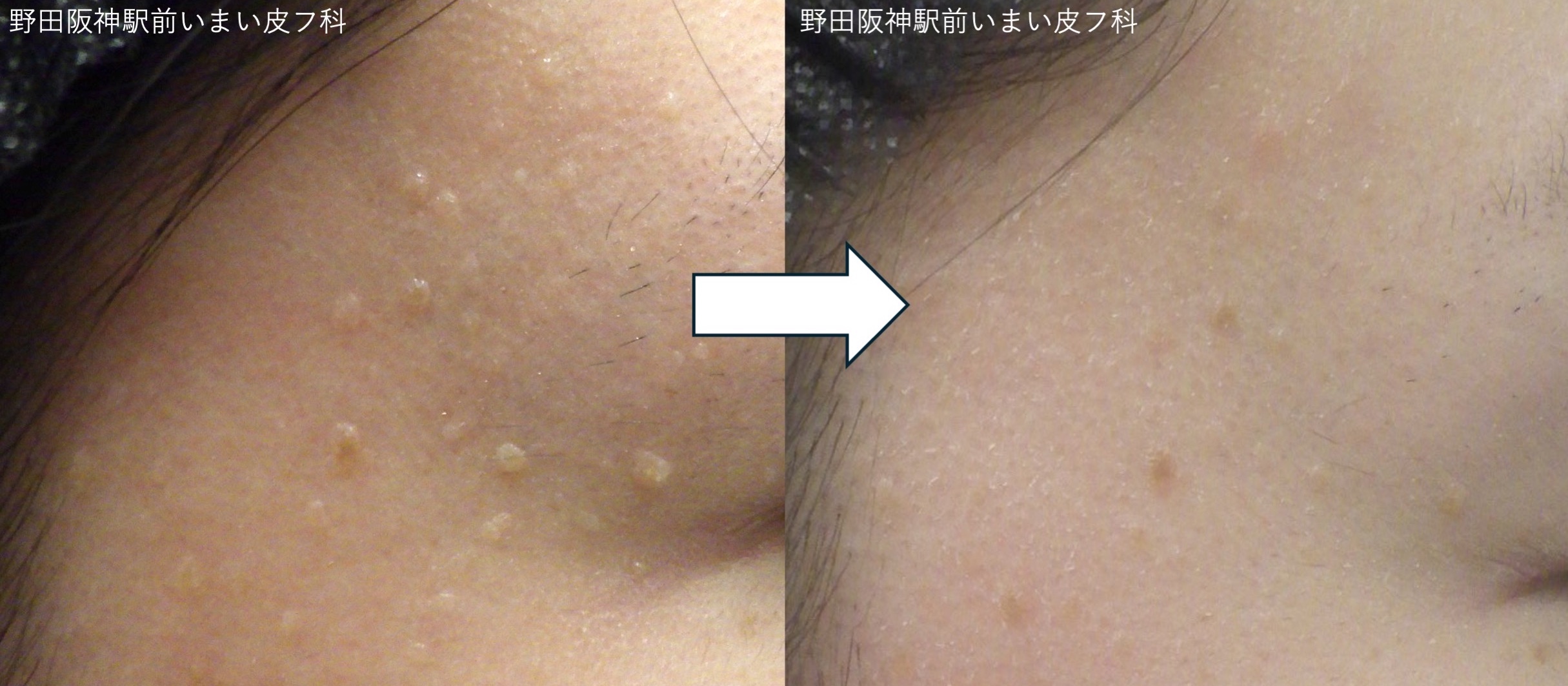 上記のモニター症例(日本人症例)はイソトレチノイン40mgを4ヶ月内服しています。扁平疣贅の個数が非常に多い状態でしたが、表皮のターンオーバーが促進されることでウイルスが排泄され、疣贅が消退しています。
